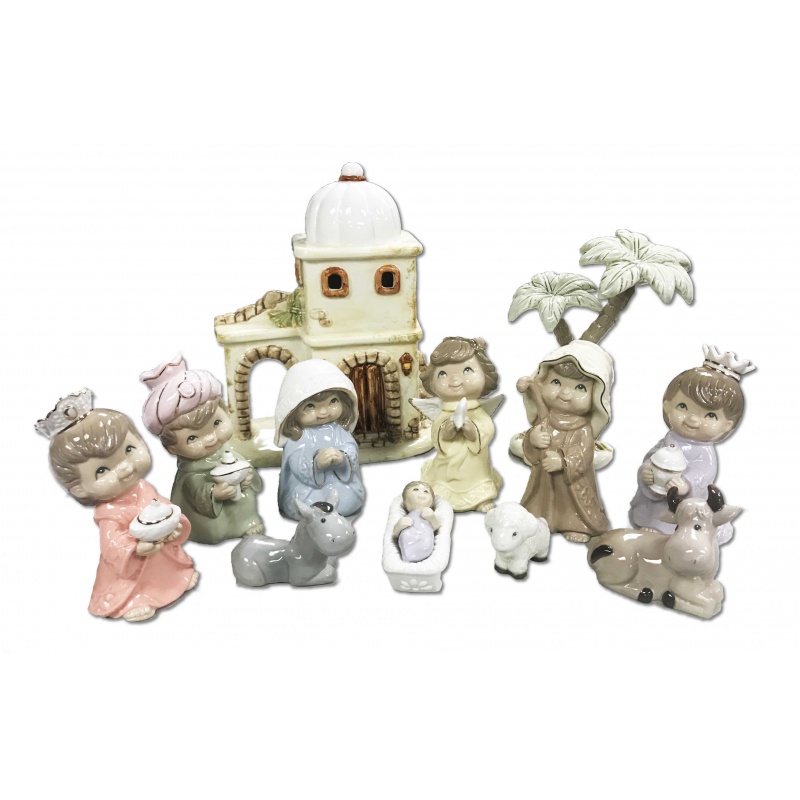 PORCELIAN NATIVITY SET 5" WITH HOUSE AND PALM TREE (12PCS)